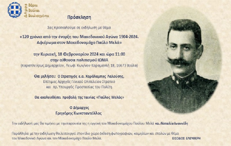 Ο Δήμος Βάρης Βούλας Βουλιαγμένης, τιμώντας τα 120 χρόνια από την έναρξη του Μακεδονικού Αγώνα διοργανώνει εκδήλωση με θέμα «120 χρόνια από την έναρξη του Μακεδονικού Αγώνα 1904 -2024 – Αφιέρωμα στον Μακεδονομάχο Παύλο Μελά», την Κυριακή 18 Φεβρουαρίου 2024 και ώρα 11:00, στο Πολιτιστικό Κέντρο Ιωνία.