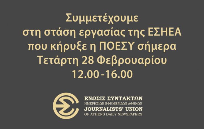 Η ΕΣΗΕΑ συμμετέχει στη στάση εργασίας που κήρυξε η ΠΟΕΣΥ αύριοΤετάρτη 28 Φεβρουαρίου, 12.00-16.00
