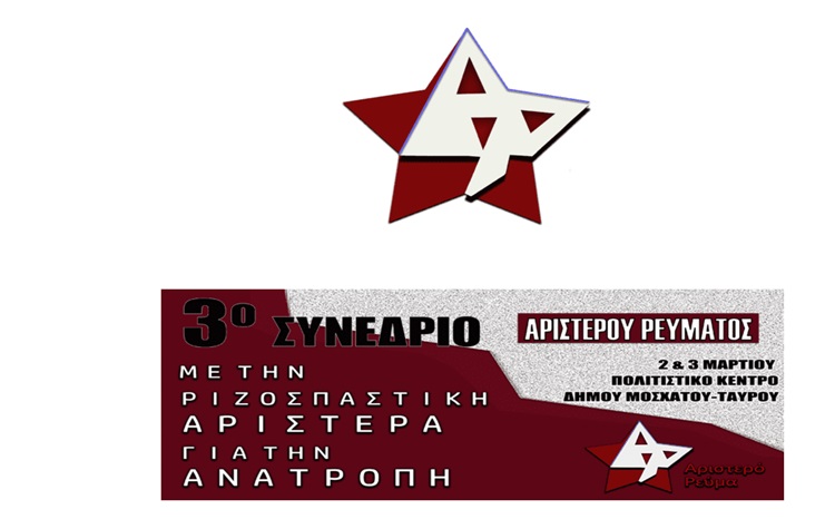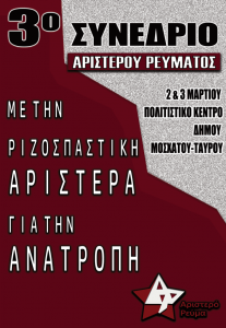 Όλα αυτά θα συζητηθούν στο 3ο Συνέδριο του Αριστερού Ρεύματος – Λαϊκή Ενότητα, που θα πραγματοποιηθεί Σάββατο 2 Μαρτίου από τις 2:00 μμ έως τις 9:00 μμ και την Κυριακή 3 Μαρτίου από τις 10:00 πμ έως τις 5:00 μμ στο Πολιτιστικό Κέντρο του Δήμου Μοσχάτου – Ταύρου, Σολωμού 30, Μοσχάτο (750 μέτρα από τον Σταθμό – Μοσχάτο του ΗΣΑΠ).