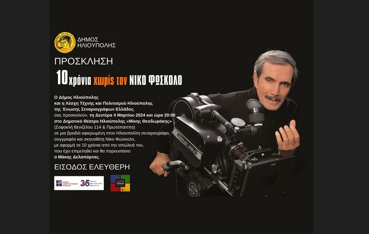 Μια βραδιά τιμής και αγάπης για τον Νίκο Φώσκολο διοργανώνουν αποψε, Δευτέρα 4 Μαρτίου 2024 στις 20:00, με ελεύθερη είσοδο, ο Δήμος Ηλιούπολης και η Λέσχη Τέχνης και Πολιτισμού Ηλιούπολης της Ένωσης Σεναριογράφων Ελλάδος, στο Δημοτικό Θέατρο «Μίκης Θεοδωράκης», στην Ηλιούπολη (Σοφοκλή Βενιζέλου 114 & Πρωτόπαπα).