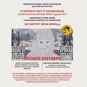 Με το βραβευμένο ντοκιμαντέρ «Ο παππούς μου ο Παπαφλέσσας» (Ελλάδα | 2022, Διάρκεια: 70’) της σκηνοθέτριας Κλεώνης Φλέσσα, συνεχίζονται την Κυριακή 10/3/2024, 8:00 μμ, στο Μουσείο Εθνικής Αντίστασης Ηλιούπολης (Μαρ. Αντύπα 134 και Σοφ. Βενιζέλου 100) οι προβολές της Κινηματογραφικής Λέσχης Ηλιούπολης. Η είσοδος για το κοινό είναι ελέυθερη.