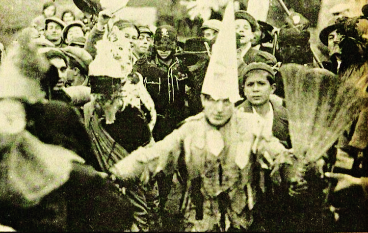 Κάποια στιγμή η γυναίκα άκουσε την πόρτα της κουζίνας να ανοίγει, τρίζοντας ανατριχιαστικά, και στο άνοιγμά της να παρουσιάζεται ένας ψηλός καρναβαλιστής ντυμένος με παράξενα στρατιωτικά ρούχα, γεμάτα σιρίτια και παράσημα. Τα χέρια του τα έκρυβε με μαύρα πέτσινα γάντια, και στο πρόσωπο αλλά και σε όλο το κεφάλι φορούσε σκούρα μάσκα του Χίτλερ με το χαρακτηριστικό μουστάκι του. Το αίμα της γυναίκας είχε παγώσει. Τρέμοντας ολόκληρη, ρώτησε: «- Ποιος είσαι εσύ; Είσαι από το χωριό μας ή είσαι από τους ξένους;» Ο άνθρωπος δεν είπε τίποτα. Έσφιξε μόνο τη ζώνη της στολής του, και με ανοιχτά τα χέρια, πλησίασε και αγκάλιασε τη Μυρσίνη, που είχε σηκωθεί όρθια και τον έσπρωχνε με όση δύναμη της είχε απομείνει, παραπατώντας και ουρλιάζοντας μπερδεμένα λόγια: «- Φύγε… φύγε τώρα, εδώ είναι το σπίτι μου…» είπε, και ξαφνικά τρέμοντας ολόκληρη, λες και τα πόδια της είχαν ξεριζωθεί από τη θέση τους, και χωρίς να έχει τις αισθήσεις της, έπεσε και κουλουριάστηκε με τα μάτια κλειστά στο πάτωμα του σπιτιού. Είχε λιποθυμήσει. Τότε, αμέσως από τη μισάνοιχτη πόρτα της κουζίνας έφυγε τρέχοντας ο μασκαρεμένος άντρας και μπλέχτηκε στο πλήθος που γιόρταζε και διασκέδαζε ξέφρενα, προσέχοντας μη σταματήσει κανείς τον άνθρωπο με τη στολή του Χίτλερ, που έτρεχε σαν τρελός και πήγαινε να κρυφτεί κάπου. Πού; Κανείς δεν έμαθε ποτέ. Και αν κάποιος τον γνώρισε… δεν μίλησε!