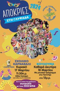«Η ώρα για το αποκριάτικο ραντεβού μας στη Γλυφάδα έφτασε! Η Κυριακή της Αποκριάς θα γιορταστεί και πάλι στην πόλη μας με το σχολικό καρναβάλι και την παρέλαση των μαθητών στην οδό Γούναρη (από την Ανθέων έως την Πλατεία Μακεδονίας) από τις 11:30 το πρωί κι αμέσως μετά με αποκριάτικο πάρτυ στην πλατεία Μακεδονίας, με τραγούδια, χορούς και εκπλήξεις! Δεν χρειάζεται φυσικά να είστε μαθητές ούτε να ανήκετε σε κάποιο από τα δεκάδες γκρουπ που έχουν φτιάξει με ενθουσιασμό τα παιδιά μας και οι σύλλογοι γονέων: Απλά φορέστε τη στολή σας ή κάτι αποκριάτικο κι ελάτε στη μεγάλη γιορτή», τονίζει ο δήμαρχος Γλυφάδας Γιώργος Παπανικολάου.