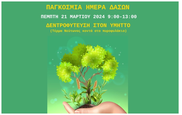Σε συνεργασία με τον Σύνδεσμο Προστασίας και Ανάπτυξης Υμηττού (ΣΠΑΥ) και το «Ολοι Μαζί Μπορούμε», ο Δήμος Ηλιούπολης συμμετέχει την Πέμπτη 21 Μαρτίου, που είναι και η Παγκόσμια Ημέρα Δασών, στη δράση δεντροφύτευσης του Υμηττού.