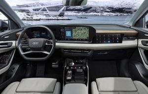 Η πανοραμική οθόνη Audi MMI και η οθόνη επιβατών MMI σχηματίζουν μια ψηφιακή εικόνα, ενώ το άνετο σαλόνι ξεχωρίζει για την ποιότητα και την εκτεταμένη χρήση ανακυκλωμένων υλικών. Το πορτμπαγκάζ διαθέτει όγκο 526 λίτρων (έως 1.529 λίτρα με τα πίσω καθίσματα αναδιπλωμένα). Επιπλέον 64 λίτρα αποθηκευτικού χώρου είναι διαθέσιμα στο frunk (εμπρός πορτμπαγκάζ) κάτω από το καπό. Η λεπτή, ελεύθερα τοποθετημένη πανοραμική οθόνη Audi MMI έχει καμπυλωτή σχεδίαση και τεχνολογία OLED και αποτελείται από το Audi virtual cockpit των 11,9 ιντσών και την οθόνη αφής MMI των 14,5 ιντσών. Ειδικά για τους εμπρός επιβάτες, η Audi συμπληρώνει τις ψηφιακές παροχές με την οθόνη MMI των 10,9 ιντσών για τον συνοδηγό. Το ψηφιακό περιβάλλον του νέου Audi Q6 e-tron περιλαμβάνει ένα νέας τεχνολογίας Head-Up Display επαυξημένης πραγματικότητας που αντιστοιχεί σε οπτικό πεδίο με διαγώνιο περίπου 88 ιντσών.
