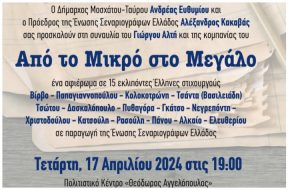 Στο πλαίσιο των εκδηλώσεων «Από το Μικρό στο Μεγάλο» θα πραγματοποιηθεί την Τετάρτη 17 Απριλίου, στις 19.00 στο αμφιθέατρο «Τζένη Βάνου» στο Πολιτιστικό Κέντρο «Θεόδωρος Αγγελόπουλος» στο Μοσχάτο, η συναυλία του Γιώργου Αλτή.