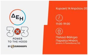 Οι δημοφιλείς αγώνες του τουρνουά ΔΕΗ 3×3 POWER TO THE HOOD by Eurohoops θα πραγματοποιηθούν την Κυριακή 14 Απριλίου, στην παραλία του Μπάτη (11πμ – 7μμ), με την αιγίδα του Δήμου Παλαιού Φαλήρου.