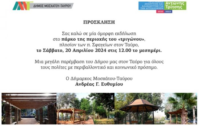 Ο δήμαρχος Μοσχάτου-Ταύρου, Ανδρέας Ευθυμίου, δήλωσε: «Το Σάββατο 20 Απριλίου στις 12 το μεσημέρι, καλώ όλους τους κατοίκους να είναι κοντά μας στην αναβαθμισμένη περιοχή που διαμορφώθηκε με στόχο να καλύψει τις ανάγκες των κατοίκων για ψυχαγωγία, περίπατο και χαλάρωση, αλλά και να βοηθήσει το μικροκλίμα της περιοχής με το ενεργειακό της προφίλ. Ένας καλαίσθητος χώρος που χρηματοδοτήθηκε από το πρόγραμμα «Αντώνης Τρίτσης» του Υπουργείο Εσωτερικών και συντελεί στην αναβάθμιση της ποιότητας της ζωής μας. Ας γιορτάσουμε το Σάββατο στον Ταύρο, σε μία όμορφη εκδήλωση για όλη την οικογένεια!».