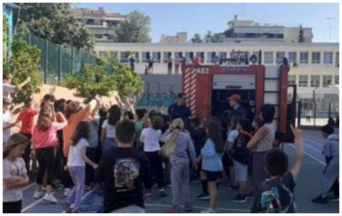 Οι συμμετέχοντες πυροσβέστες πραγματοποιούν ανοιχτό διάλογο με τα παιδιά για την πρόληψη πυρκαγιών, την έγκαιρη σήµανση συναγερµού και την εκκένωση χώρων.
