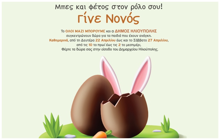 Με σύνθημα «Μπες και φέτος στο ρόλο σου! Γίνε Νονός» το “Ολοι Μαζί Μπορούμε” και ο Δήμος Ηλιούπολης διοργανώνουν δράση συγκέντρωσης Πασχαλινών δώρων, για τα παιδιά που έχουν ανάγκη.