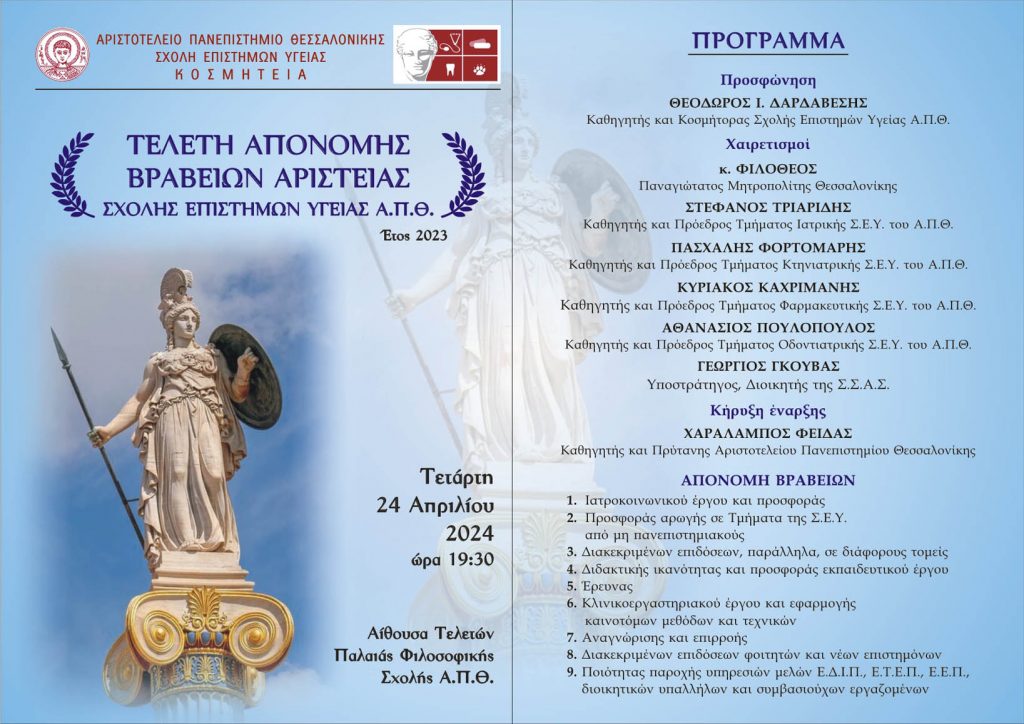Η Kοσμητεία της Σχολής Επιστημών Υγείας του Αριστοτελείου Πανεπιστημίου Θεσσαλονίκης πραγματοποιεί των τελετή Απονομής Βραβείων Αριστείας την Τετάρτη 24 Απριλίου 2024 και ώρα 19:30 στην Αίθουσα Τελετών της παλιάς Φιλοσοφικής Σχολής.