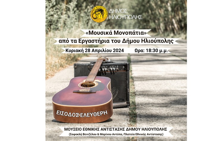 Βαδίζοντας στα μονοπάτια της σύγχρονης μουσικής σκηνής, από την pop, την rock έως και την metal, σε ελληνικό και ξένο ρεπερτόριο, το Μοντέρνο Τμήμα των Μουσικών Εργαστηρίων Δήμου Ηλιούπολης παρουσιάζει μια συναυλία, την Κυριακή 28 Απριλίου, στις 18.30 μ.μ., στο Μουσείο Εθνικής Αντίστασης (Μαρίνου Αντύπα και Σοφοκλή Βενιζέλου, Πλατεία Εθνικής Αντίστασης, Ηλιούπολη).