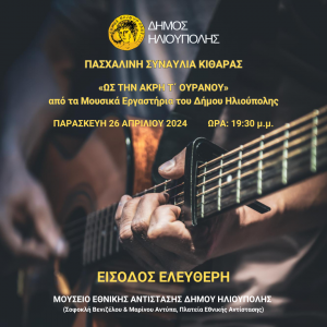 Την Παρασκευή 26 Απριλίου, στις 7.30 μ.μ., στο Μουσείο Εθνικής Αντίστασης (Μαρίνου Αντύπα και Σοφοκλή Βενιζέλου, Πλατεία Εθνικής Αντίστασης, Ηλιούπολη), οι μαθητές των Μουσικών Εργαστηρίων του Δήμου Ηλιούπολης, θα παρουσιάσουν έργα για κιθάρες, υπό την καθοδήγηση του δασκάλου τους κ. Αλέξανδρου Ζέρβα.