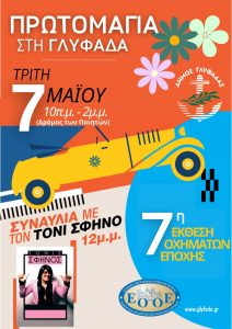 Με πλούσιο πρόγραμμα, τα αγαπημένα μας έθιμα αλλά και τον μοναδικό Τόνι Σφήνο, θα τιμήσει την επέτειο της Πρωτομαγιάς ο Δήμος Γλυφάδας στις εορταστικές εκδηλώσεις, που διοργανώνει την Τρίτη του Πάσχα 7 Μαΐου, από τις 10.00πμ-14.00μμ, στο κέντρο της πόλης.
