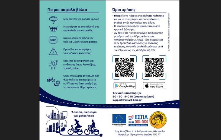Μπορείτε να δείτε εδώ τους όρους χρήσης και λειτουργίας του Αυτοματοποιημένου Συστήματος Κοινόχρηστων Ποδηλάτων και τις οδηγίες χρήσης της σχετικής εφαρμογής.
