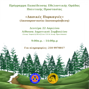 Τη Δευτέρα 22 Απριλίου 2024 από τις 9:00 π.μ έως τις 14:00 θα διεξαχθεί στο Δήμο Ηλιούπολης «Πρόγραμμα Εκπαίδευσης Εθελοντικών Ομάδων Πολιτικής Προστασίας» με θεματικό πεδίο «Δασικές Πυρκαγιές» (Δασοπροστασία-Δασοπυρόσβεση) σε συνεργασία με το Πυροσβεστικό Σώμα, το οποίο απευθύνεται σε Εγγεγραμμένα Μέλη της Εθελοντικής Ομάδας Πολιτικής Προστασίας του Δήμου Ηλιούπολης.