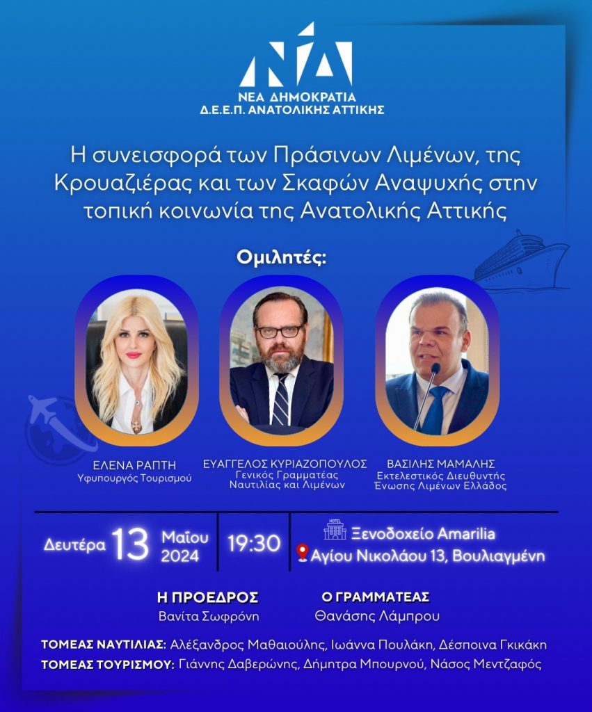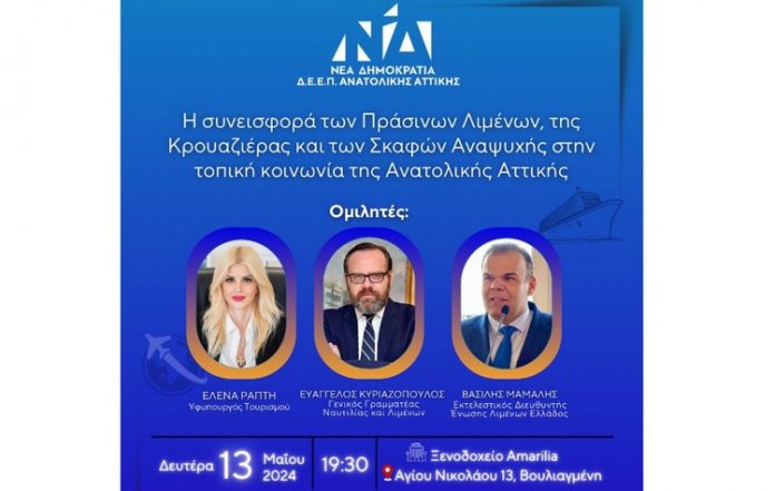 H ΔΕΕΠ Ανατολικής Αττικής της Νέας Δημοκρατίας διοργανώνει ανοιχτή εκδήλωση με θέμα “Η συνεισφορά των Πράσινων Λιμένων, της Κρουαζιέρας και των Σκαφών Αναψυχής στην τοπική κοινωνία της Ανατολικής Αττικής”.