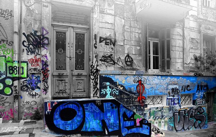 Ετοιμόρροπα και ανακαινισμένα βανδαλισμένα νεοκλασικά, πολυκατοικίες μεσοπολέμου με ευγενείς εισόδους και από καιρό χαμένα κοσμητικά γλυπτά μέλη, δαντελωτά εμπορικά σκέπαστρα και στριφογυριστές σκάλες υπηρεσίας, αποχρωματίζονται σταδιακά μπροστά στον φακό, αφήνοντας τόπο, υφή και ήχο στις ζοφερές εκρήξεις και τις μικρές πυρκαγιές των χρωμάτων, στους περιπετειώδεις ελισσόμενους λαβυρίνθους και τις συναρπαστικές μονοκονδυλιές των σχημάτων που σαν οργιώδεις κισσοί αγκαλιάζουν επίμονα την ιστορία των δρόμων και των κτηρίων, ακυρώνοντας χωρίς κρότο τη νενομισμένη της μνήμη. Επανεκκινώντας την με έναν λυγμό.»