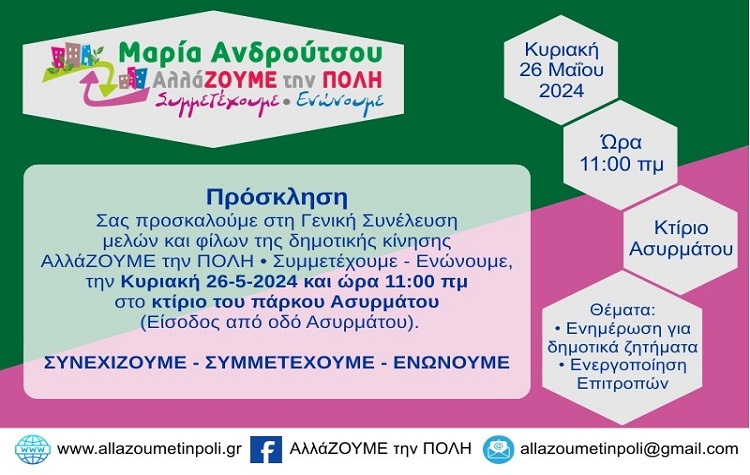 Την Κυριακή 26-5-2024 και ώρα 11:00 πμ, θα πραγματοποιηθεί Γενική Συνέλευση μελών και φίλων της δημοτικής κίνησης ΑλλάΖΟΥΜΕ την ΠΟΛΗ • Συμμετέχουμε – Ενώνουμε, στο κτίριο του πάρκου Ασυρμάτου (είσοδος από οδό Ασυρμάτου).