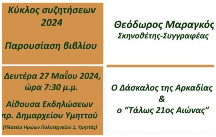 Το βιβλίο του Θεόδωρου Μαραγκού «Ο δάσκαλος της Αρκαδίας και ο Τάλως 21ος Αιώνας» παρουσιάζεται στις 19:00 το απόγευμα της Δευτέρας 27 Μαΐου ο Δήμος Δάφνης Υμηττού στην αίθουσα εκδηλώσεων του πρώην Δημαρχείου Υμηττού.