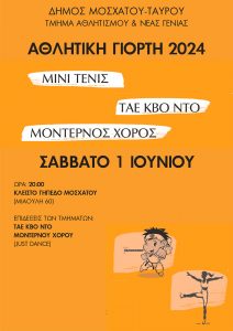 Στο κλειστό γυμναστήριο Μοσχάτου θα πραγματοποιηθεί το Σάββατο 1η Ιουνίου στις 20.00 η γιορτή λήξης των μαθημάτων, που διοργανώνει το τμήμα αθλητισμού του Δήμου Μοσχάτου- Ταύρου.
