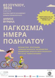 Το εκπαιδευτικό πρόγραμμα «Ασφαλώς Ποδηλατώ» πραγματοποιεί ο Δήμος Βύρωνα, σε συνεργασία με το Ινστιτούτο Οδικής Ασφάλειας «Πάνος Μυλωνάς», την Κυριακή 2 Ιουνίου 2024 στην πλατεία Γιώργου Κολημένου (πρώην Τσιρακοπούλου), στο πλαίσιο εκδηλώσεων και δράσεων για την Παγκόσμια Ημέρα Ποδηλάτου.