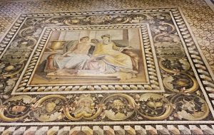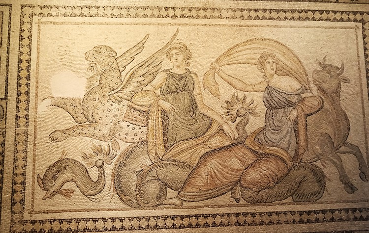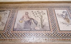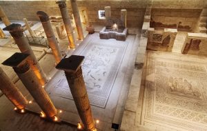 Στο μουσείο εκτίθενται καλοδιατηρημένα ψηφιδωτά δάπεδα (ελληνιστικά και ρωμαϊκά σε επιφάνεια 1700 τ.μ.), εξαιρετικής τέχνης, εμπνευσμένα όλα από την ελληνική μυθολογία και σε ελληνική (περι)γραφή (διασημότερα είναι αυτά που απεικονίζουν – κατά σειράν εδώ – τον Ωκεανό με την Τηθύ, το οποίο βρέθηκε στον πυθμένα μιας πισίνας, τον Ευφράτη, τις Μούσες Κλειώ και Ευτέρπη, την Πασιφάη και τον Δαίδαλο, τον Αχιλλέα στην αυλή του Λυκομήδη, τον Σ(C)άτυρο και την Αντιόπη, τη γέννηση της Αφροδίτης, την Τελετή (του Διονύσου), την αρπαγή της Ευρώπης, μια Μαινάδα και καθιστούς τον Έρωτα με την Ψυχή, κ.ά.