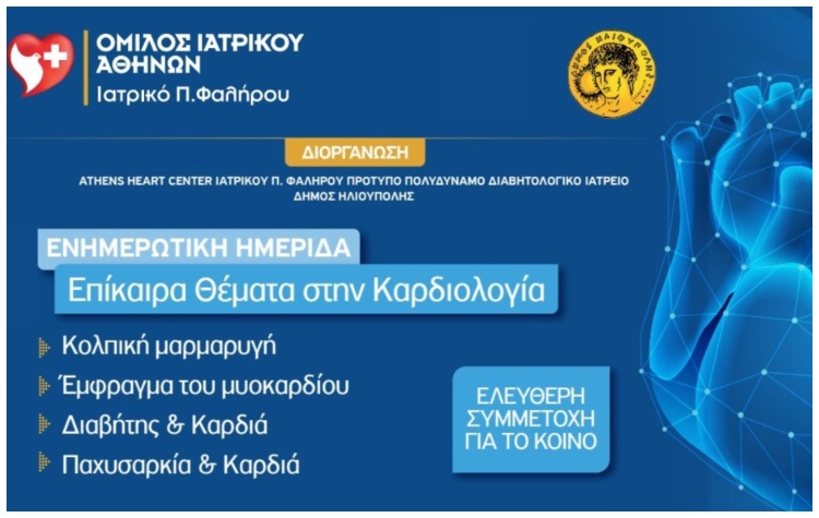 Ενημερωτική Ημερίδα για Επίκαιρα Θέματα στην Καρδιολογία συνδιοργανώνουν το απόγευμα της Τετάρτης 12 Ιουνίου στο Δημοτικό Θέατρο Ηλιούπολης «Μίκης Θεοδωράκης» ο Δήμος Ηλιούπολης και το Ιατρικό Π. Φαλήρου.