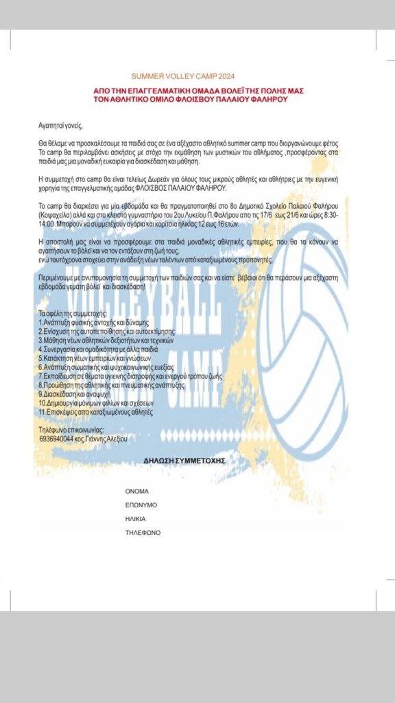Αλλά η δράση δεν σταματά εκεί. Στο χρονικό διάστημα από 17 Ιουνίου έως 21 Ιουνίου, από τις 08:30 έως τις 14:00 στο 8ο Δημοτικό Σχολείο Π. Φαλήρου και στο κλειστό της Κοψαχείλας, θα διεξαχθεί το 1ο Summer Camp Volleyball της πόλης. Εκεί όπου επαγγελματίες αθλητές και προπονητές, θα δείξουν στους συμμετέχοντες και τις συμμετέχουσες μυστικά του αθλήματος και θα τους βοηθήσουν ν’ αγαπήσουν το Volleyball, ενώ οι ταλαντούχοι/ες θα έχουν την ευκαιρία να ενταχθούν στα τμήματα υποδομής του συλλόγου.