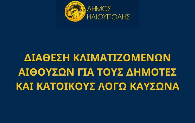 O Δήμος Ηλιούπολης, λόγω καύσωνα, θα διαθέσει από σήμερα Τρίτη 11 Ιουνίου 2024 έως και την Παρασκευή 14 Ιουνίου 2024 δύο κλιματιζόμενες αίθουσες σε 24ωρη βάση, προκειμένου οι δημότες και κάτοικοι να προστατευθούν από τις υψηλές θερμοκρασίες.