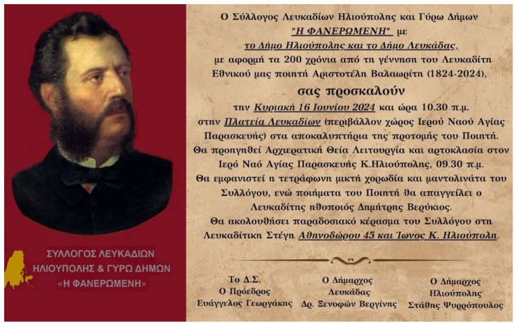 Τα αποκαλυπτήρια της προτομής του ποιητή Αριστοτέλη Βαλαωρίτη θα πραγματοποιήσει την Κυριακή 16 Ιουνίου ο Σύλλογος Λευκαδίων Ηλιούπολης και Γύρω Δήμων «Η ΦΑΝΕΡΩΜΕΝΗ» με το Δήμο Ηλιούπολης και το Δήμο Λευκάδας.