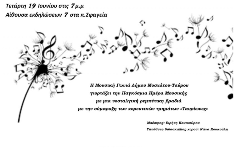 Την Παγκόσμια Ημέρα Μουσικής γιορτάζει την Τετάρτη 19 Ιουνίου η Μουσική Γωνιά του Δήμου Μοσχάτου- Ταύρου, φιλοξενώντας μία νοσταλγική ρεμπέτικη βραδιά, με τη σύμπραξη των χορευτικών τμημάτων από τους «Ταυρίωνες».