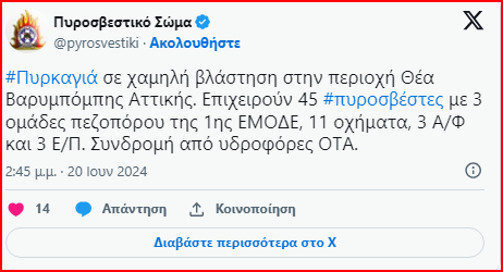 Πληροφορίες αναφέρουν πως η φωτιά καίει ξερά χόρτα και στο σημείο βρίσκονται 45 πυροσβέστες με 11 οχήματα, 3 ομάδες πεζοπόρων τμημάτων, 3 αεροσκάφη και 3 ελικόπτερα.
