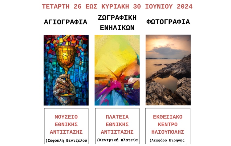 Ο Δήμος Ηλιούπολης σας προσκαλεί στις ετήσιες Εκθέσεις Ζωγραφικής ενηλίκων των Εργαστηρίων Τέχνης, όπου παρουσιάζεται η συλλογική προσπάθεια & το δημιουργικό έργο μαθητών και δασκάλων με την αμέριστη στήριξη του Ερυθρού Σταυρού.