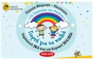 O Δήμος Ηλιούπολης έχει την τιμή να σας προσκαλέσει στην Καλοκαιρινή Γιορτή για τα Παιδιά που διοργανώνει «Το Χαμόγελο του Παιδιού» στην πλατεία Φλέμινγκ με την υποστήριξη του Δήμου Ηλιούπολης, από την Παρασκευή 28 Ιουνίου έως και την Κυριακή 30 Ιουνίου και ώρες 18:00 – 22:00.