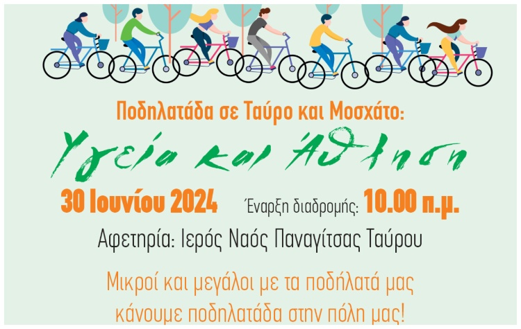 Τους κατοίκους της πόλης να πάρουν τα ποδήλατά τους και να συμμετάσχουν στην ποδηλατάδα που πραγματοποιείται στις 10 το πρωί της Κυριακής 30 Ιουνίου, καλεί ο Δήμος Μοσχάτου- Ταύρου.
