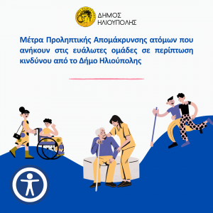 Στο πλαίσιο της εφαρμογής του μέτρου της οργανωμένης προληπτικής απομάκρυνσης πολιτών ο Δήμος Ηλιούπολης προχωράει άμεσα στη «Δημιουργία Μητρώου Ευπαθών Ομάδων» (υπ’ αριθ. Α1161/18-4-2023 Εγκ. Γ.Γ.Π.Π) σε συνεργασία με το Τμήμα Πολιτικής Προστασίας και τη Διεύθυνση Κοινωνικής Αλληλεγγύης, καλεί τα άτομα που ανήκουν στις Ευάλωτες Ομάδες και κατοικούν στα διοικητικά όρια του Δήμου (άτομα με αναπηρία, εμποδιζόμενα άτομα, κτλ.) ή οι προσωπικοί βοηθοί τους ή τα άμεσα συγγενικά τους πρόσωπα να επικοινωνήσουν με την κα. Νίκου Βασιλική (Σημείο Αναφοράς ΑμεΑ) στο Τμήμα Προστασίας & Προαγωγής της Δημόσιας Υγείας , τηλ. Επικοινωνίας 210 9970055 (vnikou@ilioupoli.gr) και να παρέχουν στοιχεία, εφόσον το επιθυμούν, τα οποία θα καταγραφούν σε ένα μητρώο για την έγκαιρη ενημέρωση και ειδοποίησή τους από τις δημοτικές αρχές σε περίπτωση εφαρμογής του μέτρου της οργανωμένης προληπτικής απομάκρυνσης πολιτών στην περιοχή που διαβιούν για να αποφευχθεί διακινδύνευσή τους σε περίπτωση έκτακτης ανάγκης.