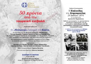 Εκδήλωση για τα 50 χρόνια από την τουρκική εισβολή στην Κύπρο, διοργανώνει ο Δήμος Βάρης Βούλας Βουλιαγμένης, τη Δευτέρα 15 Ιουλίου, ώρα 20.30, στο Δημοτικό Θέατρο Βέμπο (Λεωφόρος Κ. Καραμανλή 14, Παραλία Βούλας).