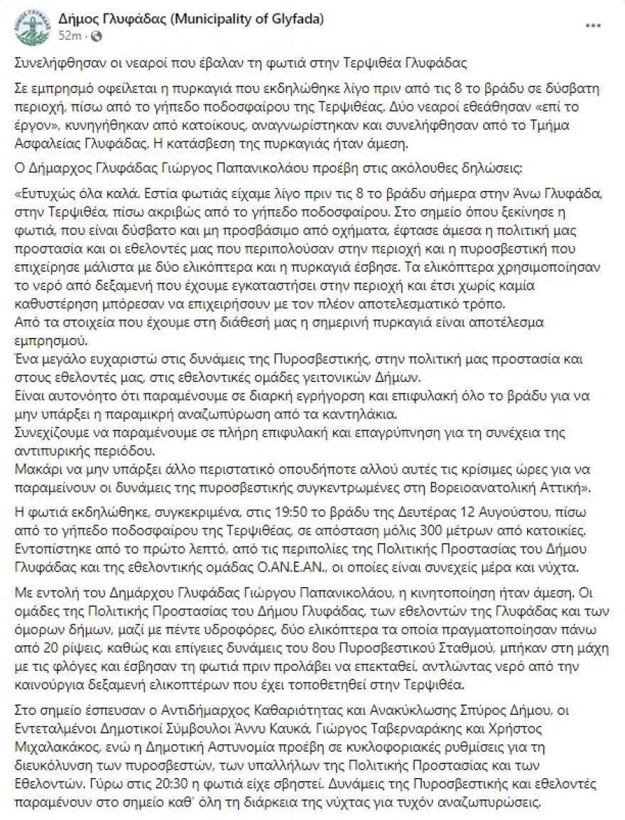 «Ευτυχώς όλα καλά. Εστία φωτιάς είχαμε λίγο πριν τις 8 το βράδυ σήμερα στην Άνω Γλυφάδα, στην Τερψιθέα, πίσω ακριβώς από το γήπεδο ποδοσφαίρου. Στο σημείο όπου ξεκίνησε η φωτιά, που είναι δύσβατο και μη προσβάσιμο από οχήματα, έφτασε άμεσα η πολιτική μας προστασία και οι εθελοντές μας που περιπολούσαν στην περιοχή και η πυροσβεστική που επιχείρησε μάλιστα με δύο ελικόπτερα και η πυρκαγιά έσβησε. Τα ελικόπτερα χρησιμοποίησαν το νερό από δεξαμενή που έχουμε εγκαταστήσει στην περιοχή και έτσι χωρίς καμία καθυστέρηση μπόρεσαν να επιχειρήσουν με τον πλέον αποτελεσματικό τρόπο.