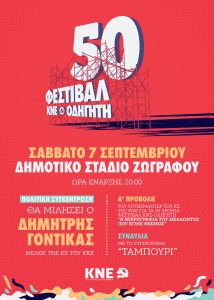 Τιμώντας, λοιπόν, την 50χρονη αυτή πορεία, το Σάββατο 7 Σεπτεμβρίου 2024, το Κεντρικό Συμβούλιο της ΚΝΕ διοργανώνει μεγάλη φεστιβαλική εκδήλωση της ΚΝΕ εκεί που ξεκίνησαν όλα, στο Γήπεδο Ζωγράφου.