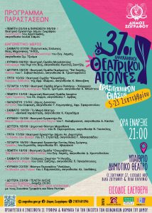 Στις 5 Σεπτεμβρίου ξεκινούν στο Υπαίθριο Δημοτικό θέατρο Ζωγράφου οι 37οι Πανελλήνιοι Θεατρικοί Αγώνες Ερασιτεχνικών Θιάσων του Δήμου Ζωγράφου. Οι αγώνες θα