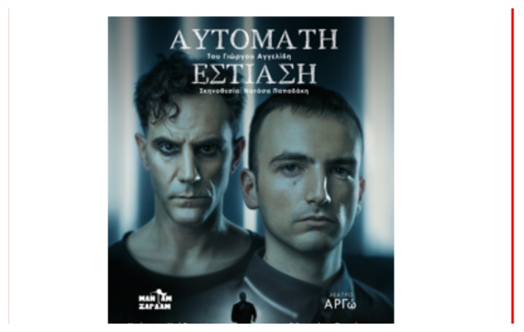 Το νέο ψυχολογικό θρίλερ του βραβευμένου συγγραφέα και σεναριογράφου Γιώργου Αγγελίδη έρχεται στο Θέατρο Αργώ σε σκηνοθεσία Νατάσας Παπαδάκη από την Πέμπτη 17 Οκτωβρίου και κάθε Πέμπτη με τους Οδυσσέα Πετράκη και Χρήστο Ντόβα στους πρωταγωνιστικούς ρόλους.
