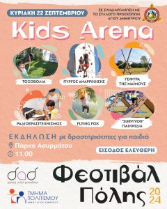 Την Κυριακή 22 Σεπτεμβρίου έχει σειρά η «Kids Arenα», μία εκδήλωση με διαδραστικά παιχνίδια και αθλητικές δραστηριότητες για παιδιά, στο Πάρκο Ασυρμάτου