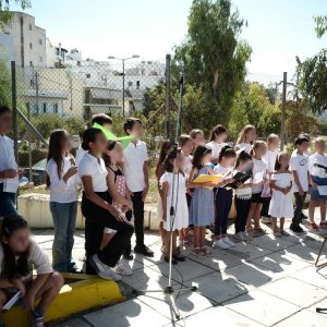 Την παράσταση έκλεψαν οι απαγγελίες ποιημάτων και ιστορικών βιογραφικών αποσπασμάτων από μαθητές της 6ης τάξης του δημοτικού του 20ού Δημοτικού Σχολείου Ηλιούπολης και του 13ου Δημοτικού Σχολείου της πόλης. Η εκδήλωση ολοκληρώθηκε με τραγούδια από την Παιδική χορωδία του Δήμου Ηλιούπολης που διευθύνει η Μαέστρος Βαρβάρα Κουτίβα με συνοδεία μπουζουκιού από τον Νίκο Καραχάλιο και τη συμμετοχή μαθητών του 20ού Δημοτικού Σχολείου Ηλιούπολης. Η ανάκρουση του Εθνικού Ύμνου έγινε επίσης από την Παιδική Χορωδία του Δήμου Ηλιούπολης.