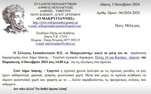 Παράσταση διαμαρτυρίας στις 2μμ στον Δήμο Δάφνης Υμηττού (Ελλης 16 και Κανάρη, Δάφνης) διοργανώνει ο Σύλλογος Εκπαιδευτικών Α/βάθμιας εκπαίδευσης Δάφνης – Υμηττού, Νέου Κόσμου, Αγίου Αρτεμίου, για τις ελλείψεις υλικοτεχνικής υποδομής και προσωπικού στα σχολεία της περιοχής.