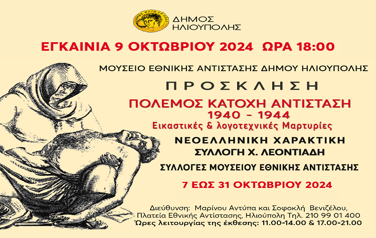 Το Μουσείο Εθνικής Αντίστασης Ηλιούπολης τιμώντας τα 80 χρόνια από την απελευθέρωση της Αθήνας (12 Οκτωβρίου 1944), διοργανώνει από 7 έως 31 Οκτωβρίου 2024, έκθεση χαρακτικής με θέμα: «ΠΟΛΕΜΟΣ – ΚΑΤΟΧΗ – ΑΝΤΙΣΤΑΣΗ, 1940-1944, Εικαστικές & λογοτεχνικές μαρτυρίες».