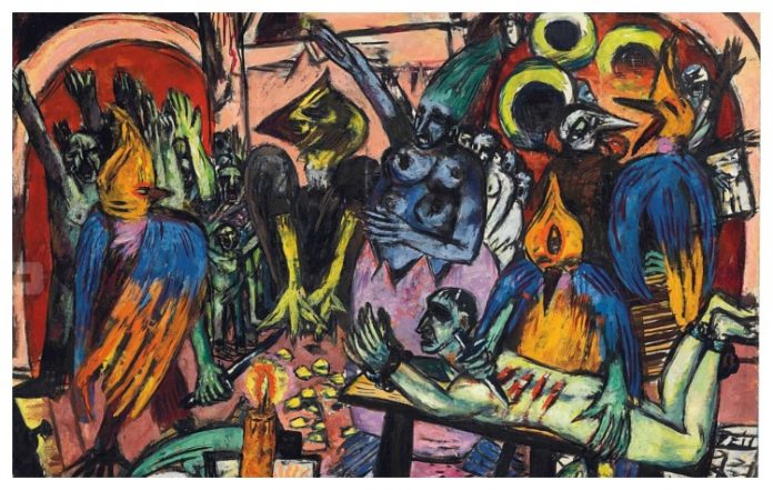 O Μαξ Μπέκμαν / Max Beckmann γεννήθηκε το 1884 στη Λειψία. Αποφοίτησε το 1903 από την Ακαδημία Τέχνης της Βαϊμάρης. Τότε τον θεωρούσαν ως το σημαντικότερο νέο ζωγράφο της Γερμανίας. Εμπνεόταν τα θέματα του από τα σύγχρονα γεγονότα, όπως το ναυάγιο του «Τιτανικού» και ο σεισμός που έγινε στην Μεσσήνη. Το 1914 κατατάχτηκε εθελοντικά στο Στρατό, πιστεύοντας ότι θα αποκόμιζε εμπειρίες οι οποίες θα ήταν χρήσιμες για την εικαστική δημιουργία του. Υπηρέτησε ως νοσοκομειακός στρατιωτικός στη Φλάνδρα και επηρεάστηκε έντονα από την ωμότητα και τη βιαιότητα του πολέμου. Το έργο του η «Νύχτα» που χρονολογείται από το 1919 παρουσιάζει ακριβώς αυτή την σκληρότητα. Το 1921, ολοκλήρωσε ένα άλλο έργο με τίτλο «Αναχώρηση», το οποίο ήταν ένα αλληγορικό επίκεντρο. Με ανάλογες τρίπτυχες συνθέσεις ασχολήθηκε μέχρι το τέλος της ζωής του. Ο Α’ παγκόσμιος πόλεμος τον επηρέασε βαθιά και έφυγε από τον στρατό με σοβαρές ψυχολογικές διαταραχές. Μετά από την τραυματική του εμπειρία, το ζωγραφικό του ύφος άλλαξε πολύ. Επιλέγοντας θρησκευτικά, μυθολογικά και θεατρικά θέματα άσκησε έντονη κριτική στην κοινωνία της εποχής του. Το 1932 οι ναζιστές χαρακτήρισαν την τέχνη του «εκφυλισμένη» και τον αναγκάζουν να παραιτηθεί από την Σχολή Καλών Τεχνών της Φραγκφούρτης, ενώ παράλληλα απομακρύνονται τα έργα του από τα μουσεία. Μέχρι το 1937 κατασχέθηκαν συνολικά πάνω από 500 πίνακες. Το 1937 παράμεινε στο Άμστερνταμ, καθόλη την διάρκεια της γερμανικής κατοχής. Το 1947 έφυγε στις ΗΠΑ. O καλλιτέχνης βρέθηκε σ’ ένα περιβάλλον που ενθάρρυνε την ιδιότυπη καλλιτεχνική δημιουργία και που εκτιμούσε την δουλειά του. Όμως η επάνοδoς του στο καλλιτεχνικό προσκήνιο ήταν μικρής διάρκειας. Τρία χρόνια αργότερα, πέθανε από καρδιακή προσβολή, καθ’ οδόν προς το Μητροπολιτικό Μουσείο της Νέας Υόρκης, που είχε εκτεθεί στη συλλογή του μια από τις συγκλονιστικές αυτοπροσωπογραφίες του.