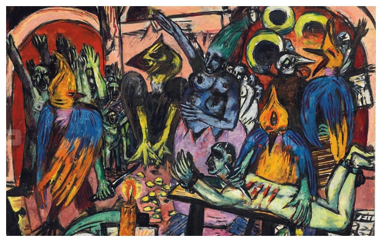Ο Μαξ Μπέκμαν, κατά περίεργο τρόπο, παραμένει απομονωμένος τόσο στη γερμανική τέχνη των αρχών του 20ού αιώνα όσο και στην ιστορία του Μοντερνισμού. Γιατί παρά την στυλιστική και θεματική του συγγένεια με τον εξπρεσιονισμό και τον «Νέο πραγματισμό / Νέα αντικειμενικότητα», η ιδεολογική του άποψη ήταν ριζικά διαφορετική: Έδρασε κυριολεκτικά μόνος ανάμεσα στους ρεαλιστές ζωγράφους της γενιάς του, πίστευε στο χρέος του καλλιτέχνη να απεικονίσει την πνευματική κατάσταση του ανθρώπου. O ίδιος έγραψε επηρεασμένος από την εμπειρία του πολέμου: «Πρέπει να μοιραστούμε όλη τη δυστυχία που έρχεται. Να δώσουμε την καρδιά και τα νεύρα μας στις φοβερές κραυγές πόνου των φτωχών, απελπισμένων ανθρώπων…Να τους δώσουμε μια εικόνα της μοίρας τους, κι αυτό μπορεί κανείς να το κάνει μόνον όταν τους αγαπά…». Μέσα σ’ αυτό το χαοτικό τοπίο, ο Μαξ Μπέκμαν, σφυρηλάτησε ένα έργο με τραγική δύναμη. Πέρα από την άμεση αναφορά μιας διαδρομής που ήταν γεμάτη σκοτάδι και τρόμο, η ζωγραφική του στόχευε στο μεταφυσικό πεδίο, θέτοντας ερωτήματα για τον άνθρωπο, και το πεπρωμένο του. Παρόλο που η έμπνευση και η τεχνοτροπία του τρέφονταν από τον φουτουρισμό, τον κυβισμό, ακόμη και από τον σουρεαλισμό, παρόλο που αξιοποιεί τα φωβιστικά μαύρα περιγράμματα του Ματίς και του Ρουώ ή τις καμπύλες φόρμες του Πικάσο, το έργο του παραμένει αταξινόμητο. Παραδόξως και στη Γαλλία, όπου ευδοκίμησαν όλα τα μεγάλα ρεύματα της πρωτοπορίας. Συμπερασματικά ο Μπέκμαν χρησιμοποίησε ιδιόμορφα την εκφραστική δύναμη της τέχνης του στην κοινωνική κριτική της οδυνηρής εποχής του.