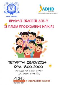 Ο Οκτώβριος έχει καθιερωθεί παγκοσμίως ως ο Μήνας Ευαισθητοποίησης για τη Διαταραχή Ελλειμματικής Προσοχής και Υπερκινητικότητας (ΔΕΠ-Υ) και το ADHD Hellas οργανώνει καμπάνια ενημέρωσης για τη ΔΕΠ-Υ σε δημοτικούς παιδικούς σταθμούς.