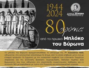 Η αναβληθείσα, λόγω καιρικών συνθηκών, εκδήλωση τιμής και μνήμης για τα “80 χρόνια από το ηρωικό μπλόκο του Βύρωνα” θα πραγματοποιηθεί την Δευτέρα 21 Οκτωβρίου και ώρα 20:00 στο Δημοτικό κινηματογράφο «Νέα  Ελβετία», όπως αναφέρεται η σχετική ανακοίνωση του Δήμου.